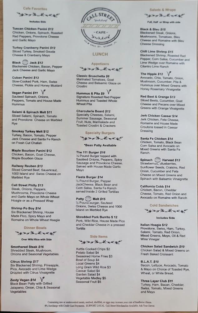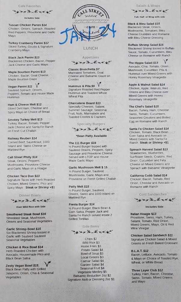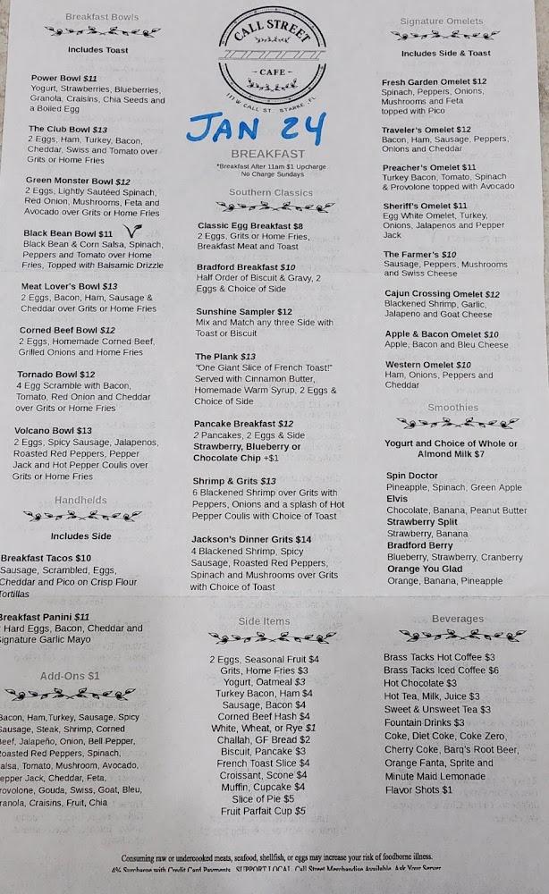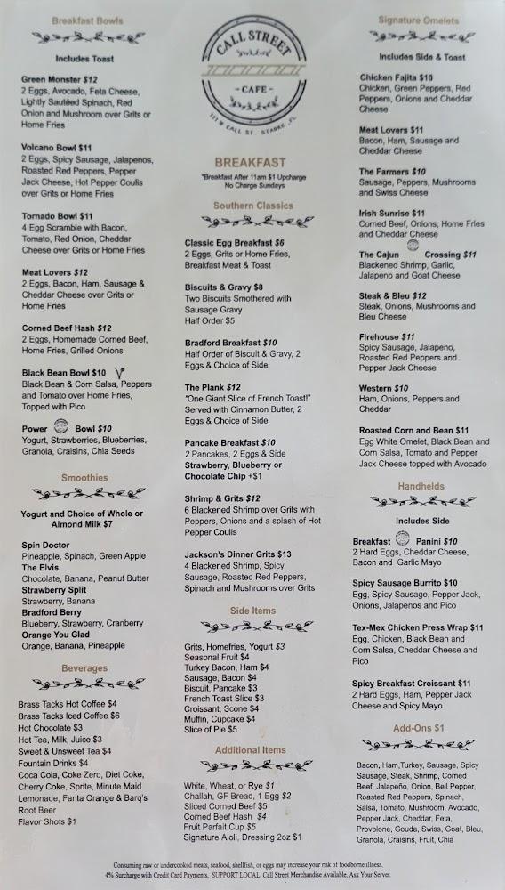 The menu at Call Street Cafe is diverse, featuring breakfast and lunch staples. Breakfast options range from omelets to pancakes, each made with high-quality ingredients. Popular items like the Traveler Omelet and Pancake Breakfast are always in demand.